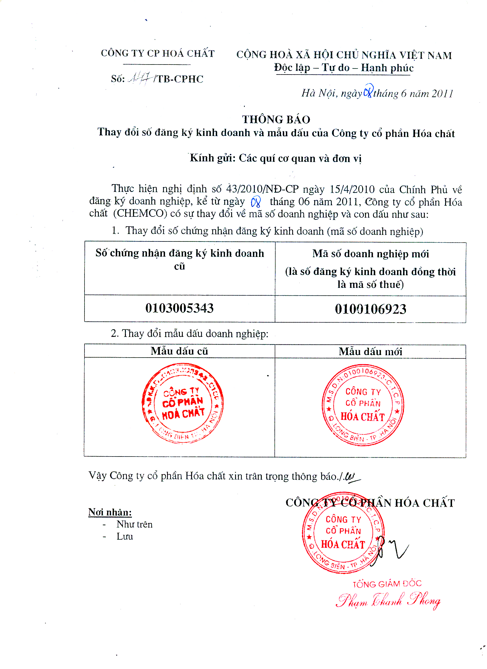 Thay đổi số đăng ký kinh doanh và mẫu dấu của Cty CP Hóa chất  ( 08/06/2011 )